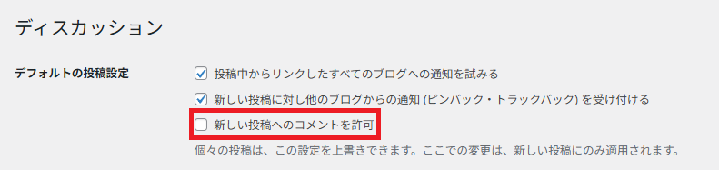設定のディスカッションに”新しい投稿へのコメントを許可”の項目をOFFにします。