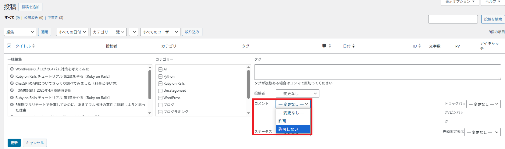 コメントを”許可しない”に設定して、更新ボタンをクリックします。