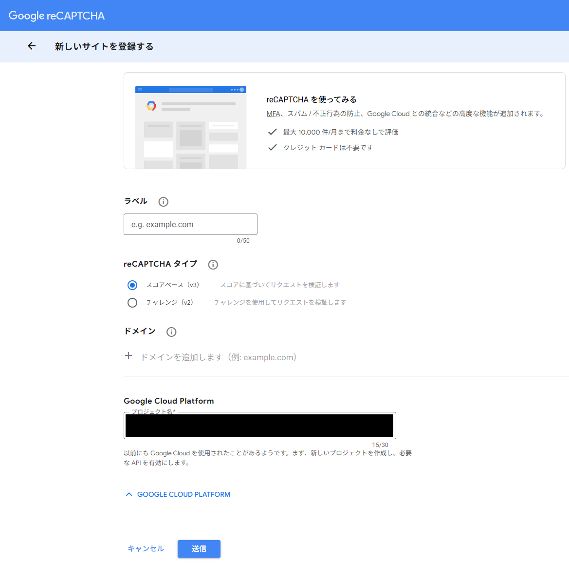 まずは、下記からGoogle reCAPTCHA v3の管理画面にアクセスします。
