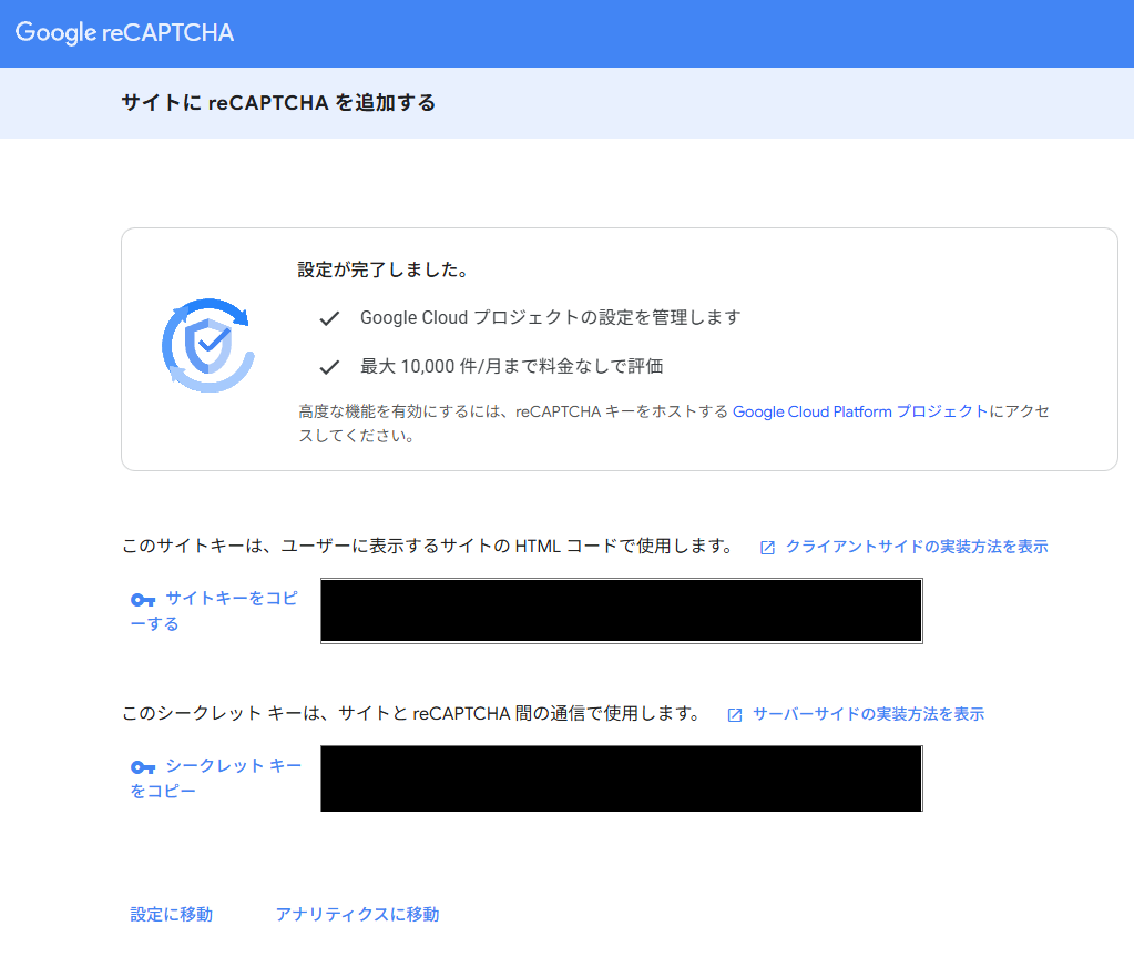 登録が完了すると、サイトキーとシークレットキーが発行されます。